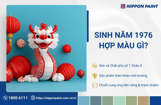Để đảm bảo chất lượng sơn bền bỉ theo thời gian, màu sắc chuẩn đẹp và an toàn cho sức khỏe, gia chủ có thể tham khảo các dòng sơn chính hãng từ Nippon Paint - thương hiệu sơn và chất phủ số 1 châu Á với hơn 2000 mã màu đa dạng, công nghệ Nhật Bản tiên tiến và định hướng phát triển bền vững. Hãy đến ngay Đại lý Sơn Nippon gần nhất hoặc liên hệ hotline 1800 6111 để được đội ngũ chuyên gia tư vấn chi tiết, giúp bạn chọn ra bảng màu phù hợp nhất với phong thủy và nhu cầu sử dụng của gia chủ sinh năm 1976.