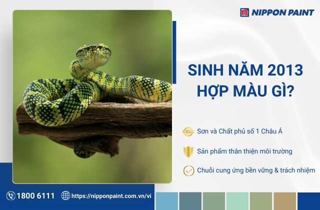 Để lựa chọn màu sơn nhà phù hợp cho phòng ngủ, phòng học hay phòng tắm hợp tuổi Quý Tỵ 2013, ưu tiên các sản phẩm chính hãng Nippon Paint với bảng màu đa dạng và chất lượng bền bỉ theo thời gian. Bạn có thể đến đại lý Nippon Paint gần nhất hoặc liên hệ hotline 1800 6111 để được tư vấn chi tiết, giúp chọn đúng gam màu hợp mệnh và phù hợp từng không gian sử dụng.