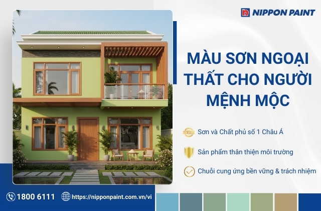 Màu sơn ngoại thất cho người mệnh Mộc cần được lựa chọn theo nguyên tắc tương hợp - tương sinh trong ngũ hành. Sự lựa chọn phù hợp sẽ giúp cân bằng phong thủy và gia tăng sinh khí cho ngôi nhà. Các gam màu như xanh lá, xanh lục, xanh ngọc (hành Mộc) hay xanh dương, đen (hành Thủy) đều là những lựa chọn phù hợp, giúp cân bằng năng lượng và hỗ trợ vận khí tích cực. Trong bài viết dưới đây, Nippon Paint sẽ gợi ý cách chọn và phối màu ngoại thất chuẩn mệnh Mộc, đảm bảo tính thẩm mỹ, góp phần thu hút tài lộc và may mắn cho gia chủ.