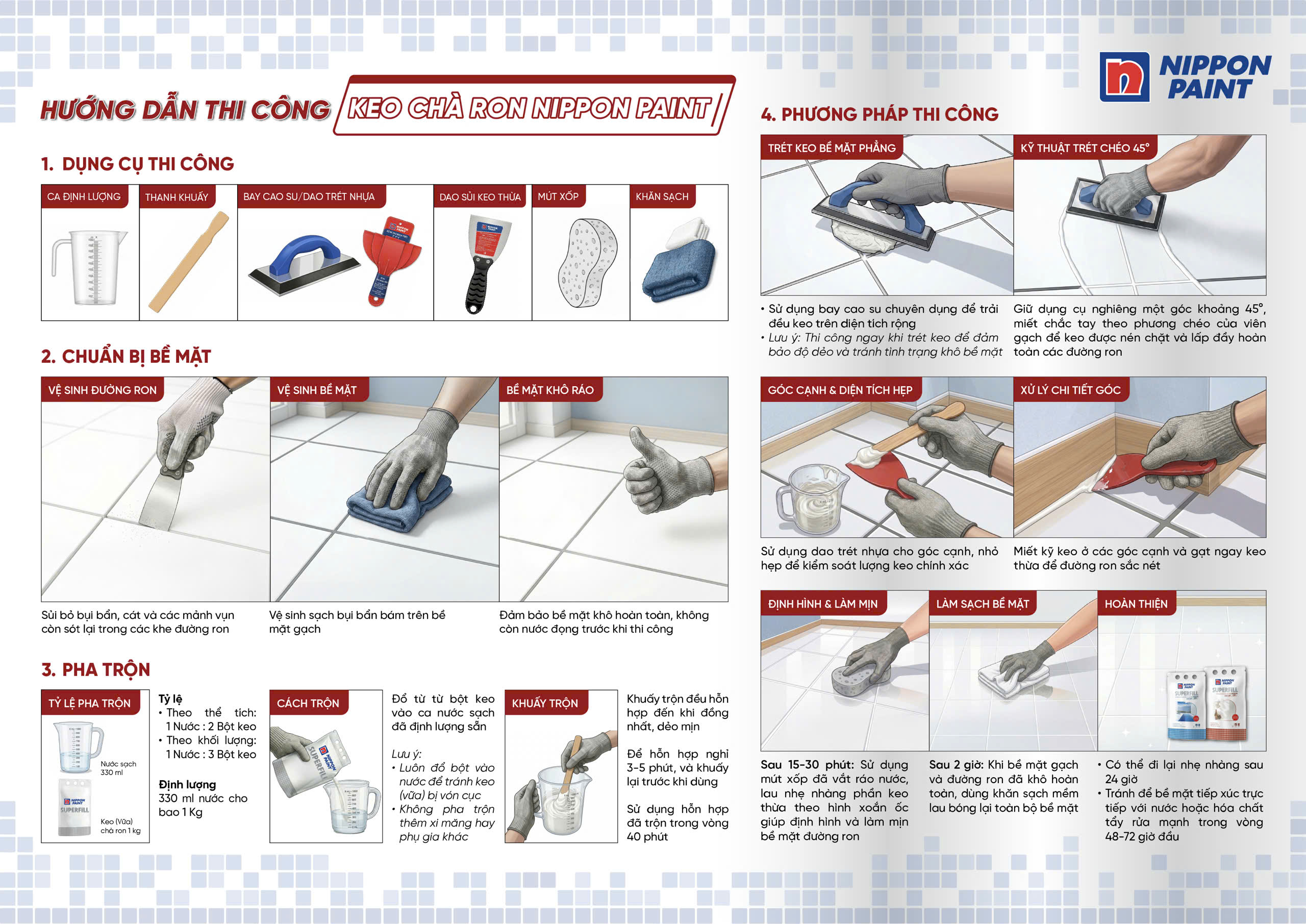 Keo chà ron Nippon Superfill là dòng vật liệu cao cấp, chuyên dụng cho cả không gian nội thất lẫn ngoại thất. Sản phẩm được sản xuất dưới dạng bột mịn, tích hợp các phụ gia đặc biệt giúp bề mặt dễ dàng vệ sinh, tăng cường khả năng kháng rêu mốc và ngăn ngừa hiện tượng rạn nứt chân chim. Tuy nhiên, để tối ưu hóa những đặc tính ưu việt như ngăn ngừa ố bẩn và duy trì màu sắc nguyên bản theo thời gian, việc tuân thủ quy trình kỹ thuật là điều bắt buộc.