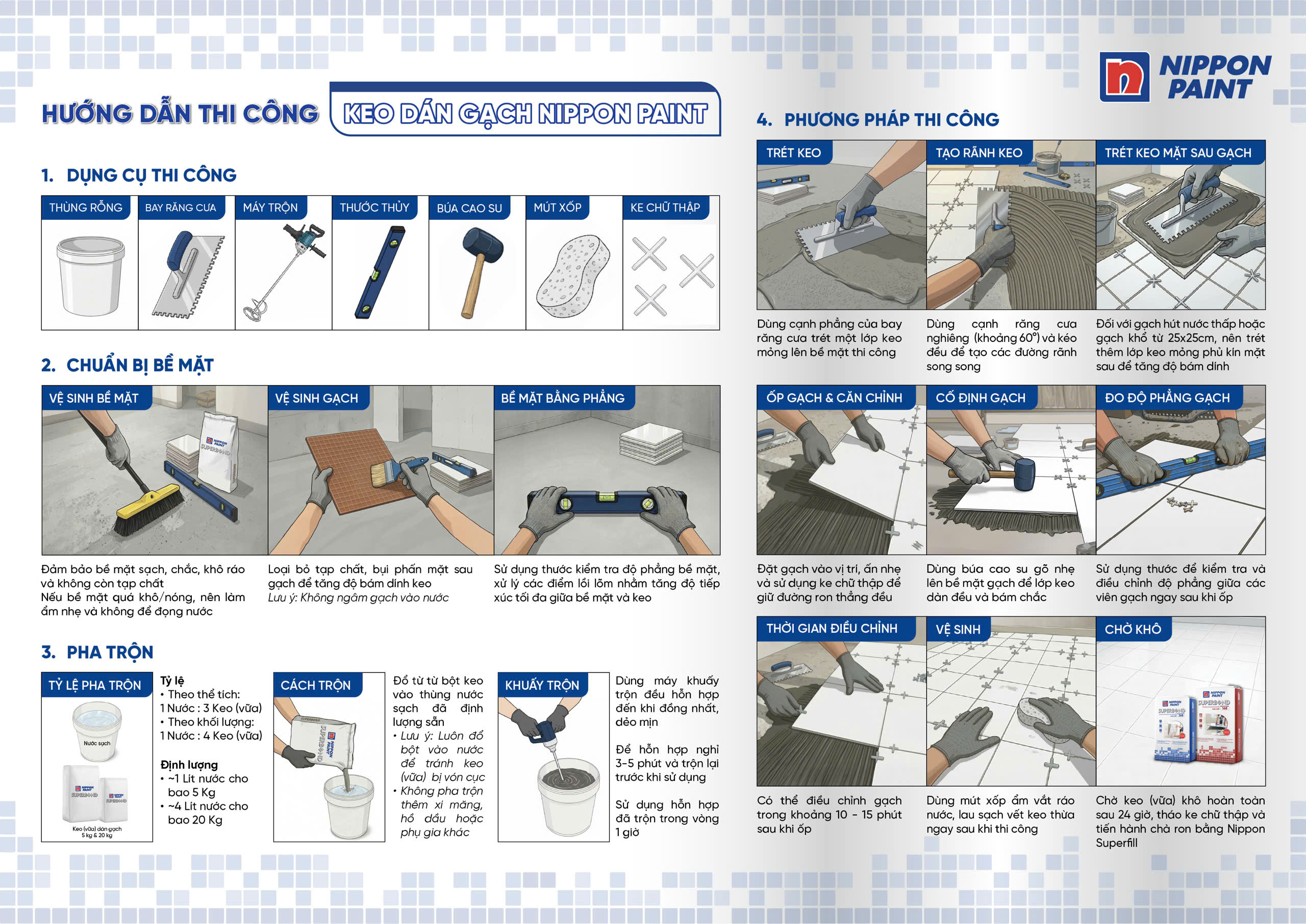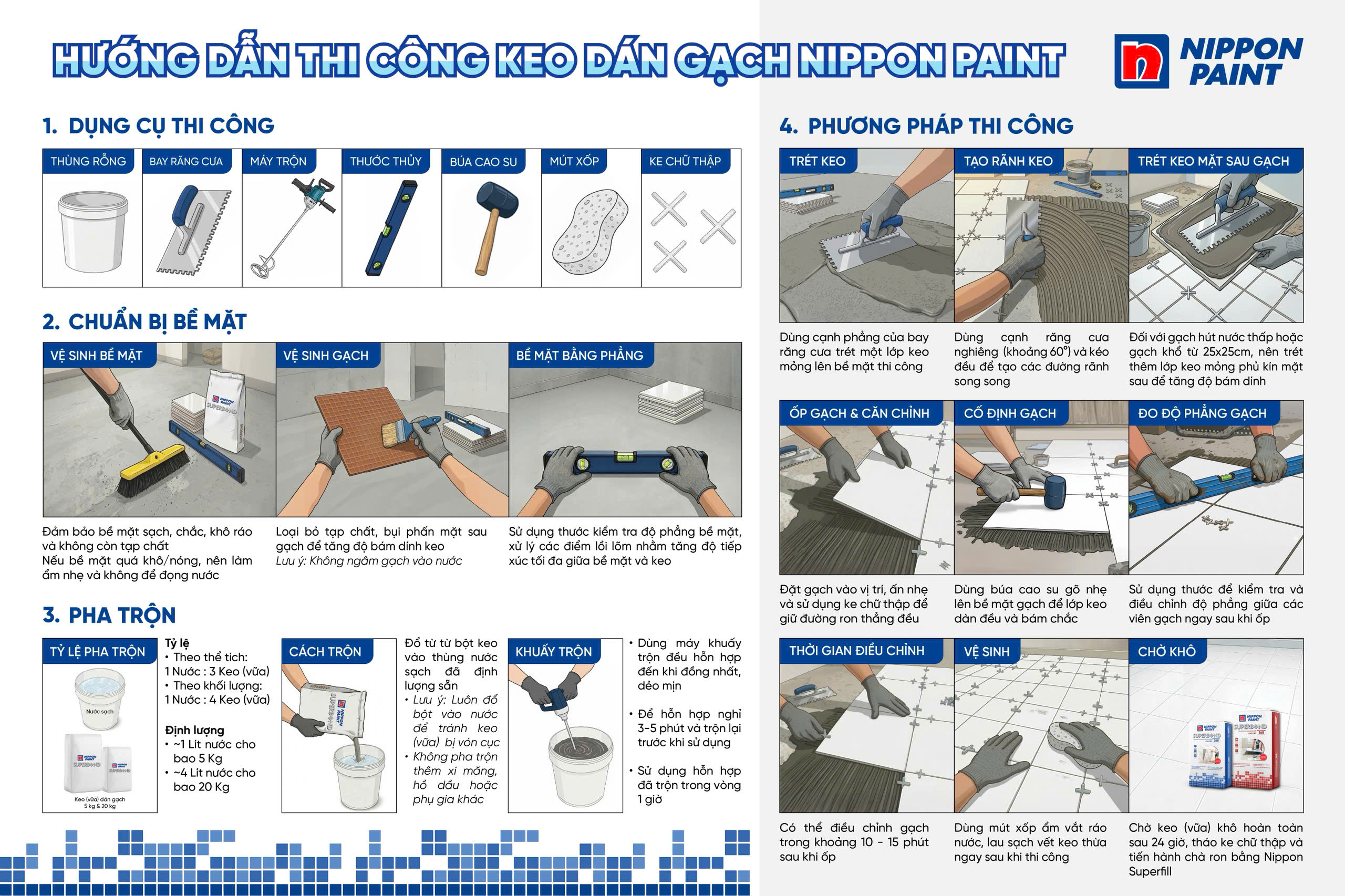 - Không pha trộn thêm xi măng, hồ dầu hoặc bất kỳ phụ gia nào khác, vì sẽ làm thay đổi đặc tính và giảm độ bám dính của sản phẩm.