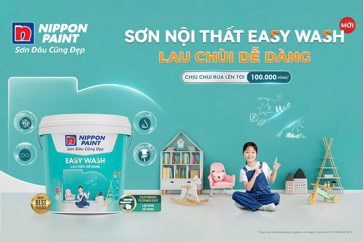 Không chỉ nổi bật với khả năng lau chùi vượt trội, Nippon Paint Easy Wash còn được nghiên cứu và sản xuất theo tiêu chuẩn an toàn nghiêm ngặt của Nippon Paint, mang đến giải pháp sơn nội thất toàn diện cho gia đình Việt – đặc biệt là những không gian có trẻ nhỏ và tần suất sinh hoạt cao.
